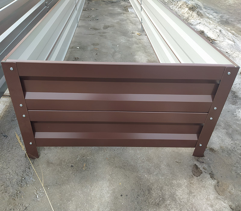 Грядки изготовлены из оцинкованного металла с полимерным покрытием толщиной 0,5 мм. Панели усилены 16 ребрами жесткости. Планка-стяжка через каждый 1 метр обеспечивает сохранность конструкции на долгие годы. Благодаря уникальной технологии, срок службы наших грядок составляет более 10 лет.